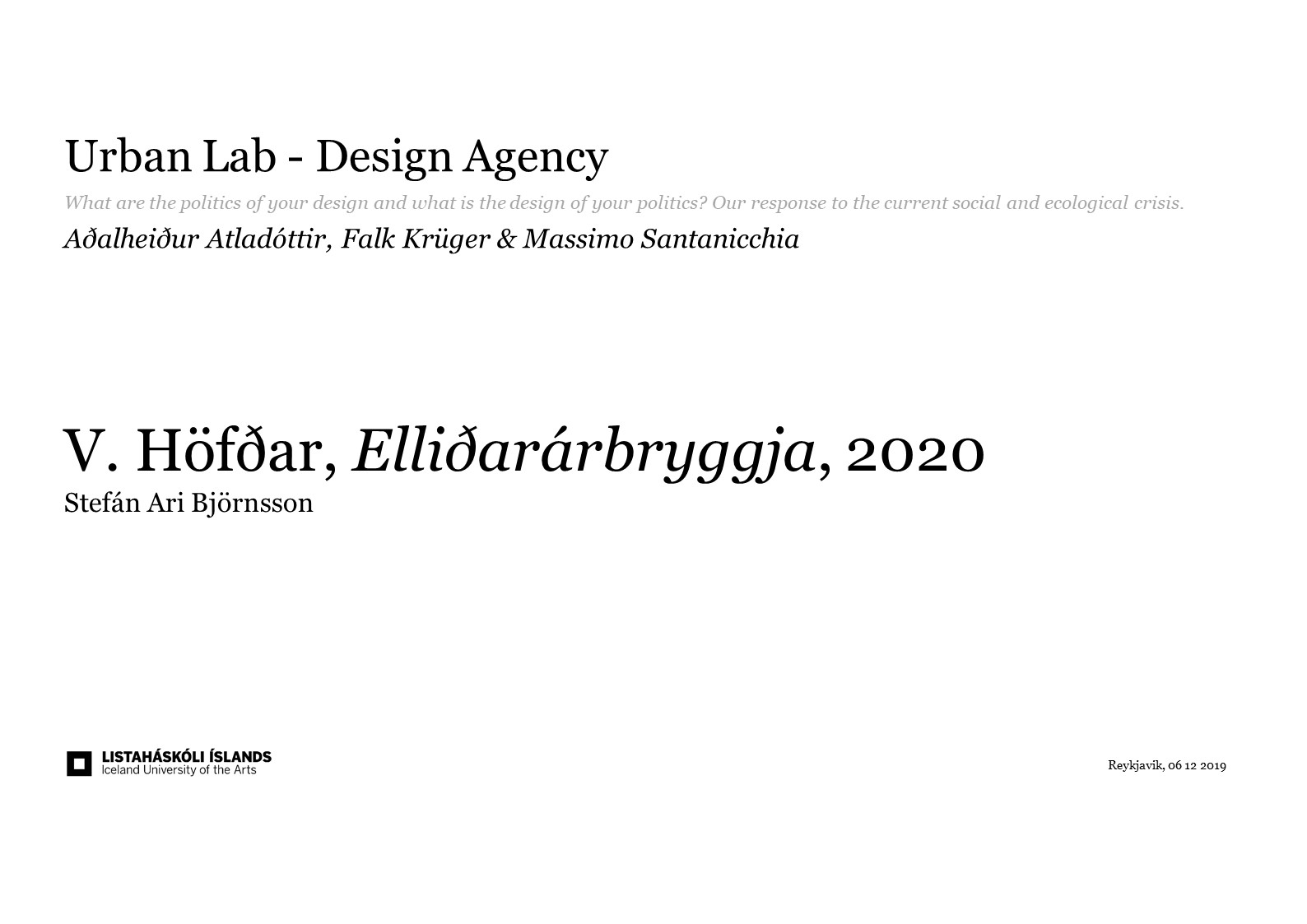 The context of the design course Urban Lab - Design Agency for the academic year 2019-2020 is the area of Höfðar which is located in Reykjavik.